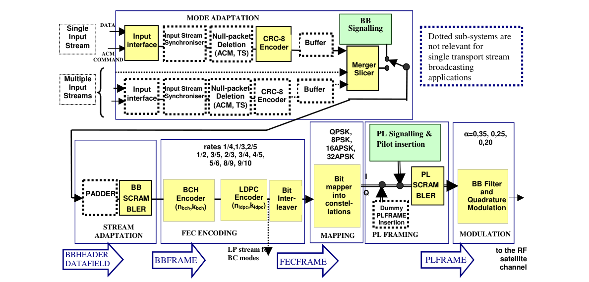 The prescribed architecture of the transmitter sub-system of DVB-S2x.